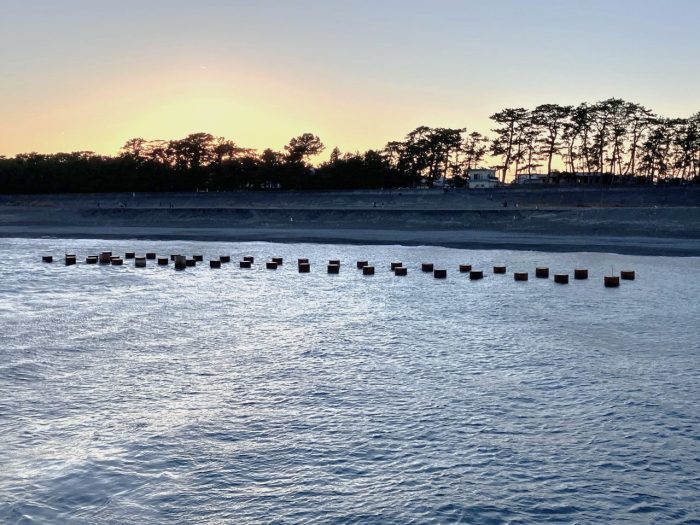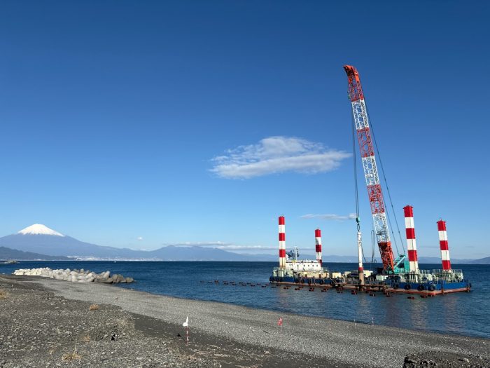 引き続き、三保海岸において、鋼管杭打設を行っています。