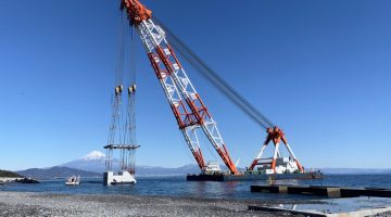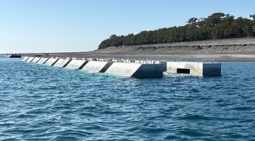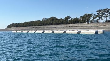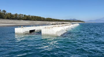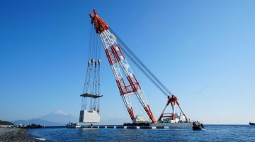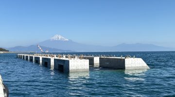 打設した鋼管杭に、陸上ヤードで製作した函体を大型起重機船で吊曳航し、設置しました。