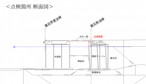 ホロー桁下の点検になるため、潜水士が桟橋下に入って点検を行います。