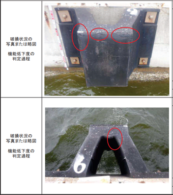 点検は色々な観点から評価しますが、主に割れの長さや欠損の面積から防舷材の劣化度を判定します。