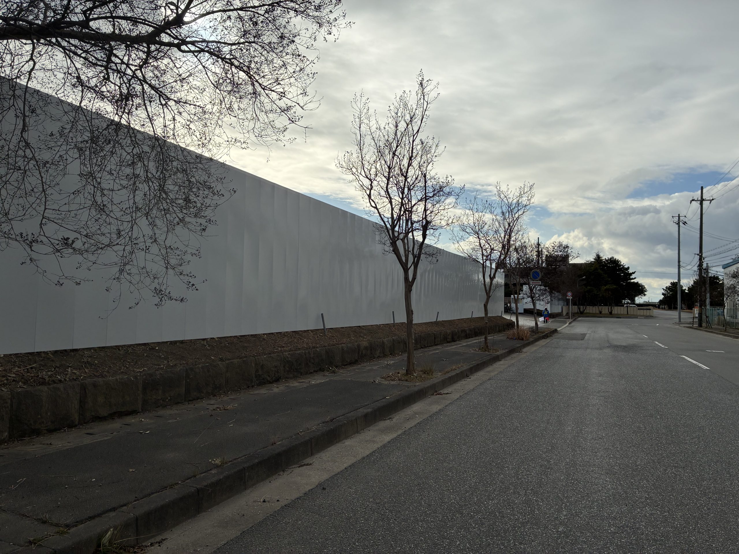 解体工事に先立って、敷地境界に仮囲い(万能塀:H=3.0m)の設置作業を行っております。