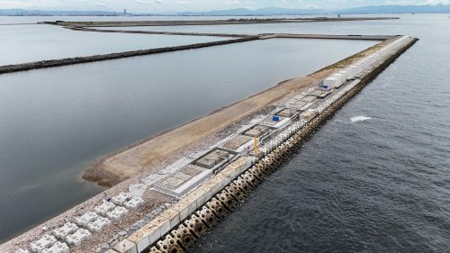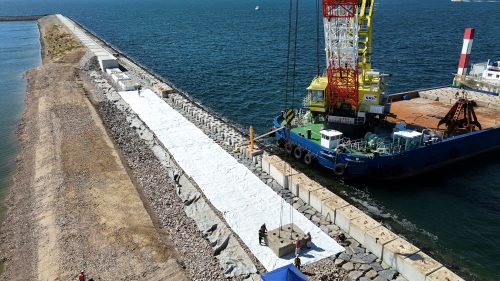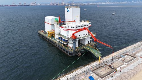 当工事は神戸港航路附帯施設での被覆ブロックの設置、本体コンクリートの打設、