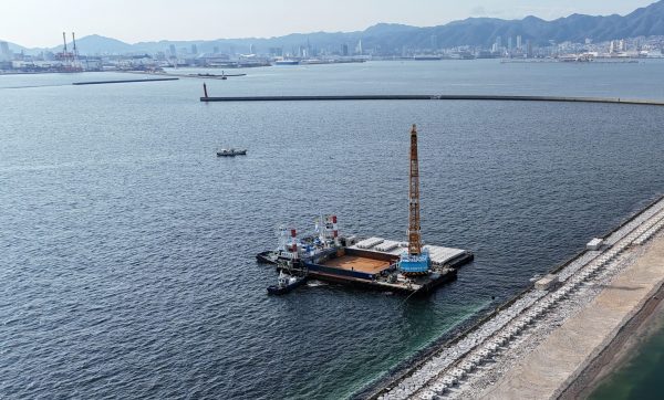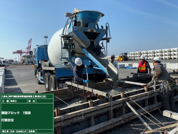 当工事は神戸港航路附帯施設での被覆ブロックの設置、本体コンクリートの打設、