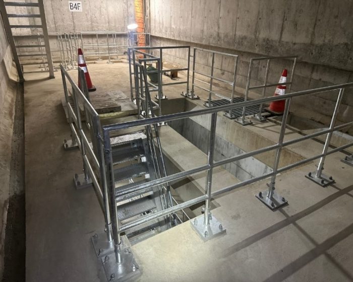完了した階に鋼製階段と防護柵を設置しました。