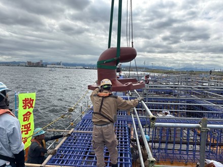 今月は、潜水士船とクレーンによる被覆石均し、係船柱設置、梁部の型枠組立、