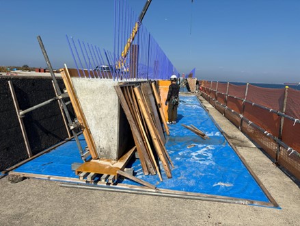 支保工架設、渡版部の鉄筋・型枠組立、プレキャスト消波板の製作を行いました。