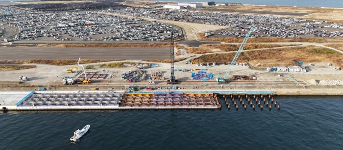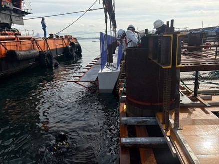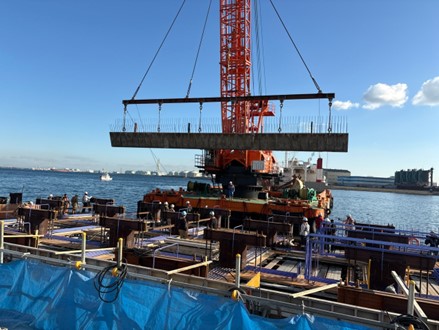 11月に製作したプレキャスト消波板の据付を起重機船にて行いました。