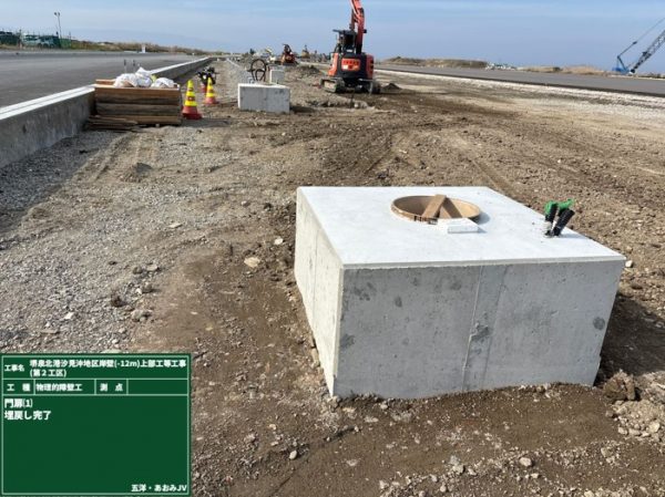 陸上にて門扉基礎の製作を掘削から型枠組立、コンクリート打設、埋戻しまで行いました。
