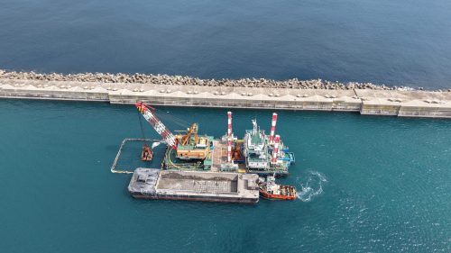 工事は、浚渫→カルシア改質土混合→カルシア改質土投入→(浚渫に戻る)のサイクルで行っています。